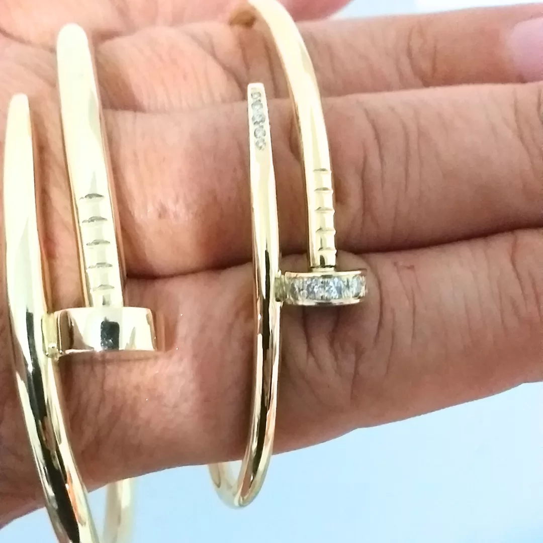Par de Braceletes Juste Un Clou Ouro 18k Maciço – Estilo Cartier Modelo Full Size (maior e mais pesado do modelo “Ao Dia”) Diâmetro aprox: 4mm (depende do tamanho) Masculino aprox: 55 gramas Feminino aprox: 35 gramas e 30 Diamantes Naturais com peso de 48 pontos