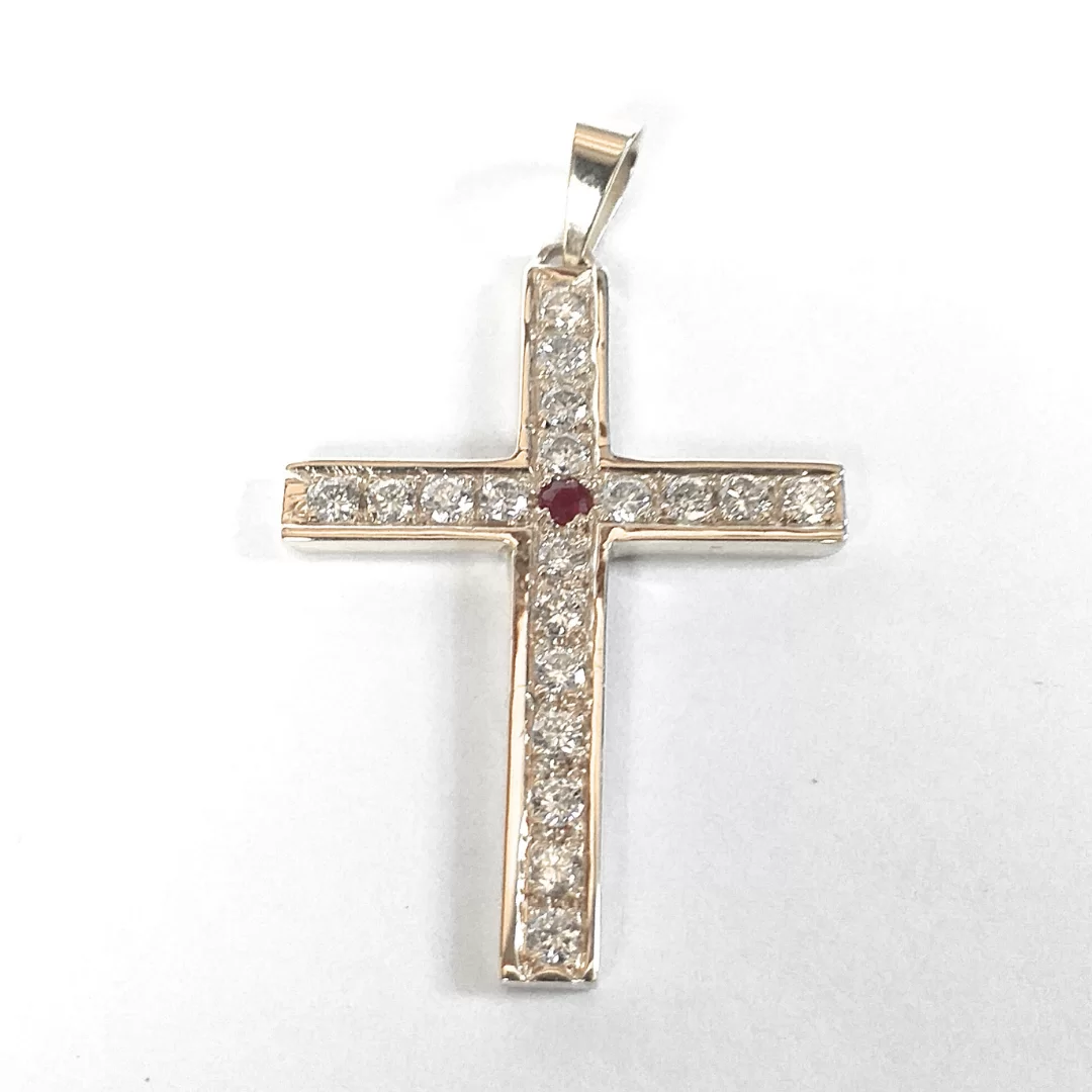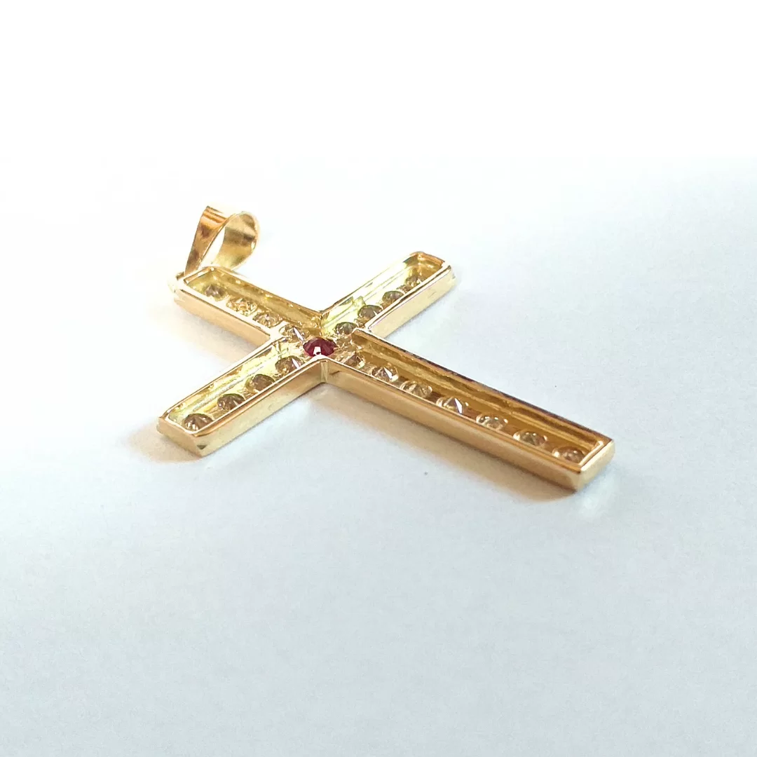 Pingente Cruz Média em Ouro 18k – Alta Joalheira – com 19 Diamantes de 7 Pontos cada e 1 Rubi de 2,5 mm – 4,5 gramas